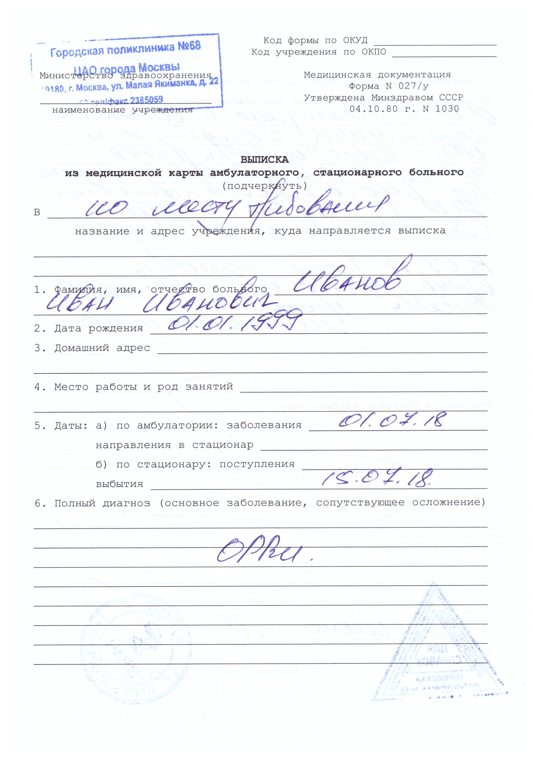 Наши курьеры доставят справку в самые кратчайшие сроки в день заказа и оформления. Эта дополнительная услуга — бесплатная. Официальная выписка с печатями из медицинской карты – это утвержденная форма, заполняемая стандартным образом, т в полном соответствии с требованиями проверяющих органов.